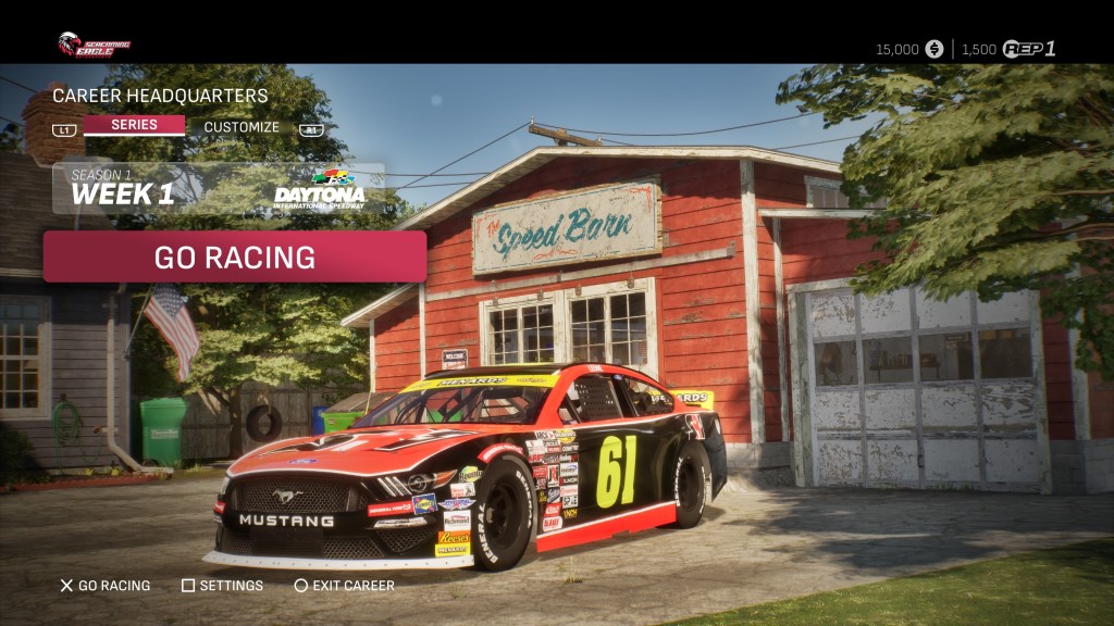 We start at your Career Headquarters, where the backyard garage has your ride ready to go for the opener with your very first sponsor on the hood. But don’t feel like you need to rush into your first race before looking the part—head over to the Customize tab to choose your team name and give your new ride a makeover in the Paint Kit, from choosing your manufacturer and car number to designing a paint scheme and picking your car colors.