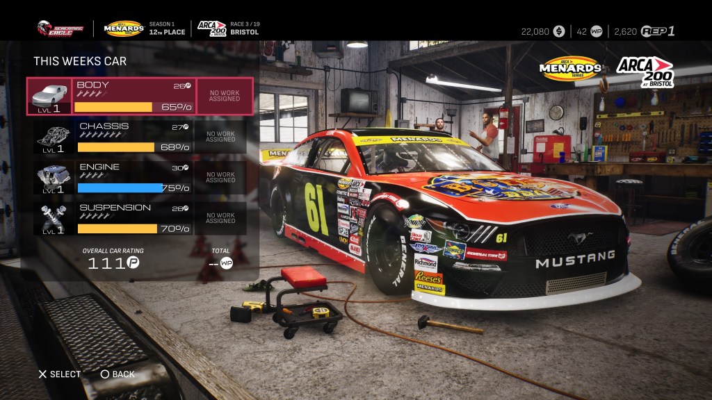An important part of your race prep is heading to the Parts Shop. Each part on your car has a rating that ranges from 0 to 100, and these scores combine for your car’s overall rating. Your first ARCA car will start out with Level 1 parts in all four categories: Body, Chassis, Engine, and Suspension. Level 1 parts carry a maximum Performance rating of 40.