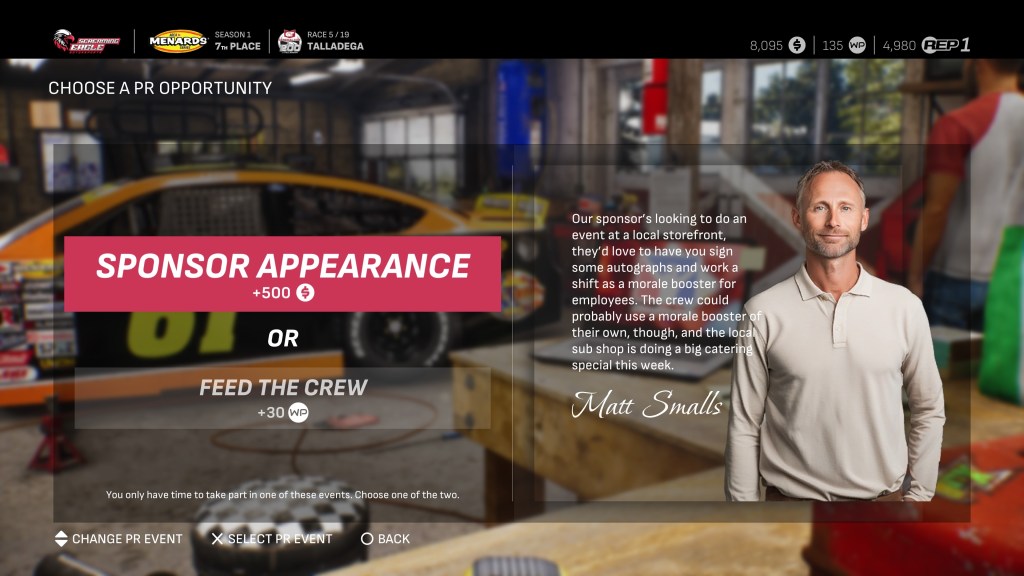 Also joining the team as you move forward will be your PR Manager, whose job is to find you additional off-track opportunities to make a few extra bucks, earn some bonus Work Points, or improve your Reputation. These opportunities won’t show up between every race, so be strategic with your choices.