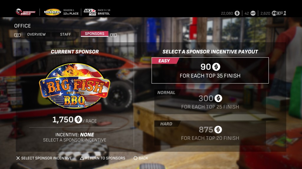 Once you’ve started turning some heads with your finishes, the new sponsor offers will start rolling in. Head to the Office and over to Sponsors to see your current sponsor, change your incentives per race for the current one, and what’s on the line with your next possible sponsor. Keep in mind that if you change your incentives, you’re eligible for higher or lower payments depending on what you pick, and your goals in each session will adjust accordingly.