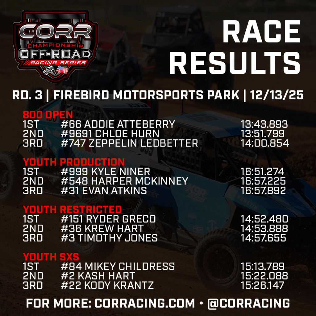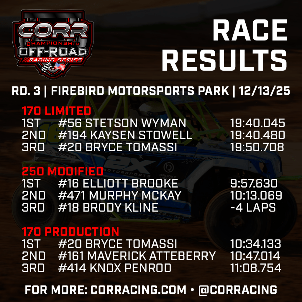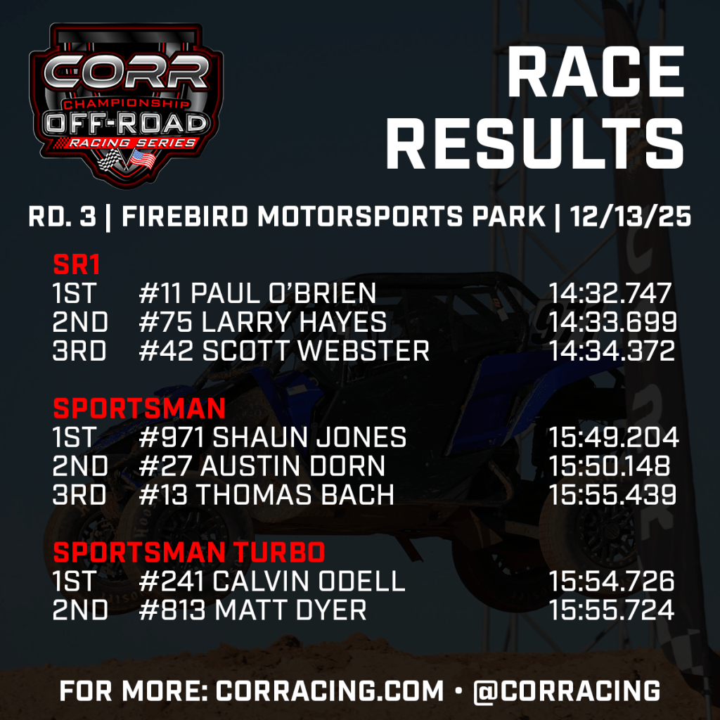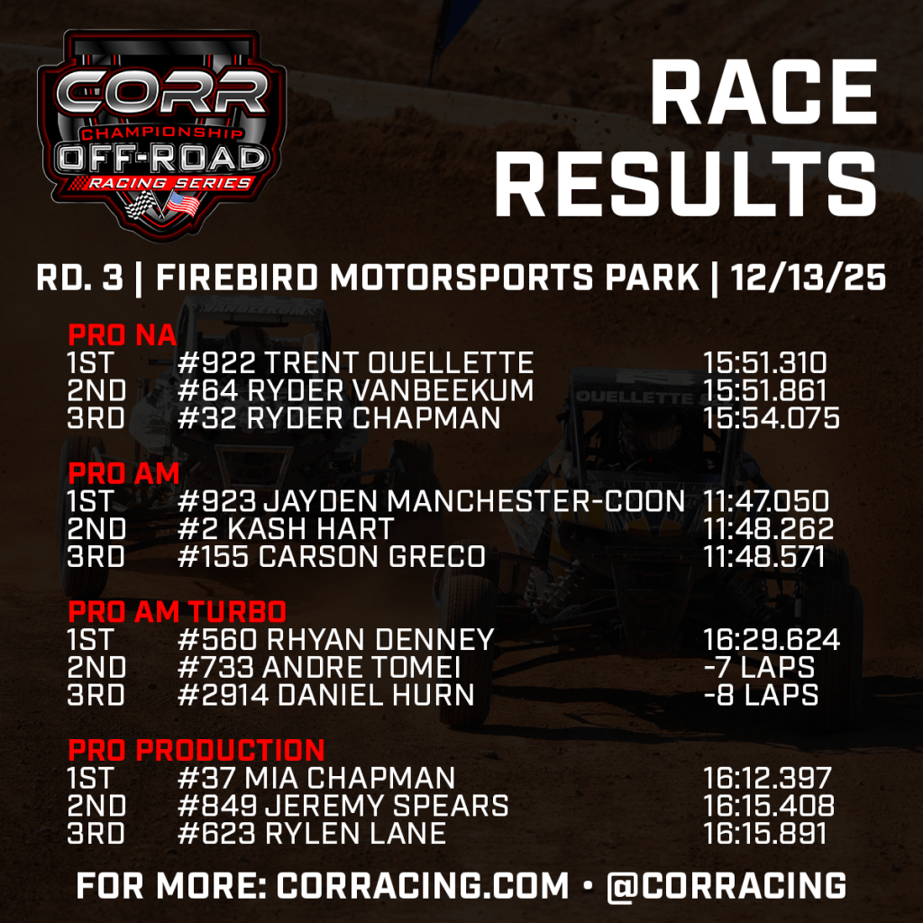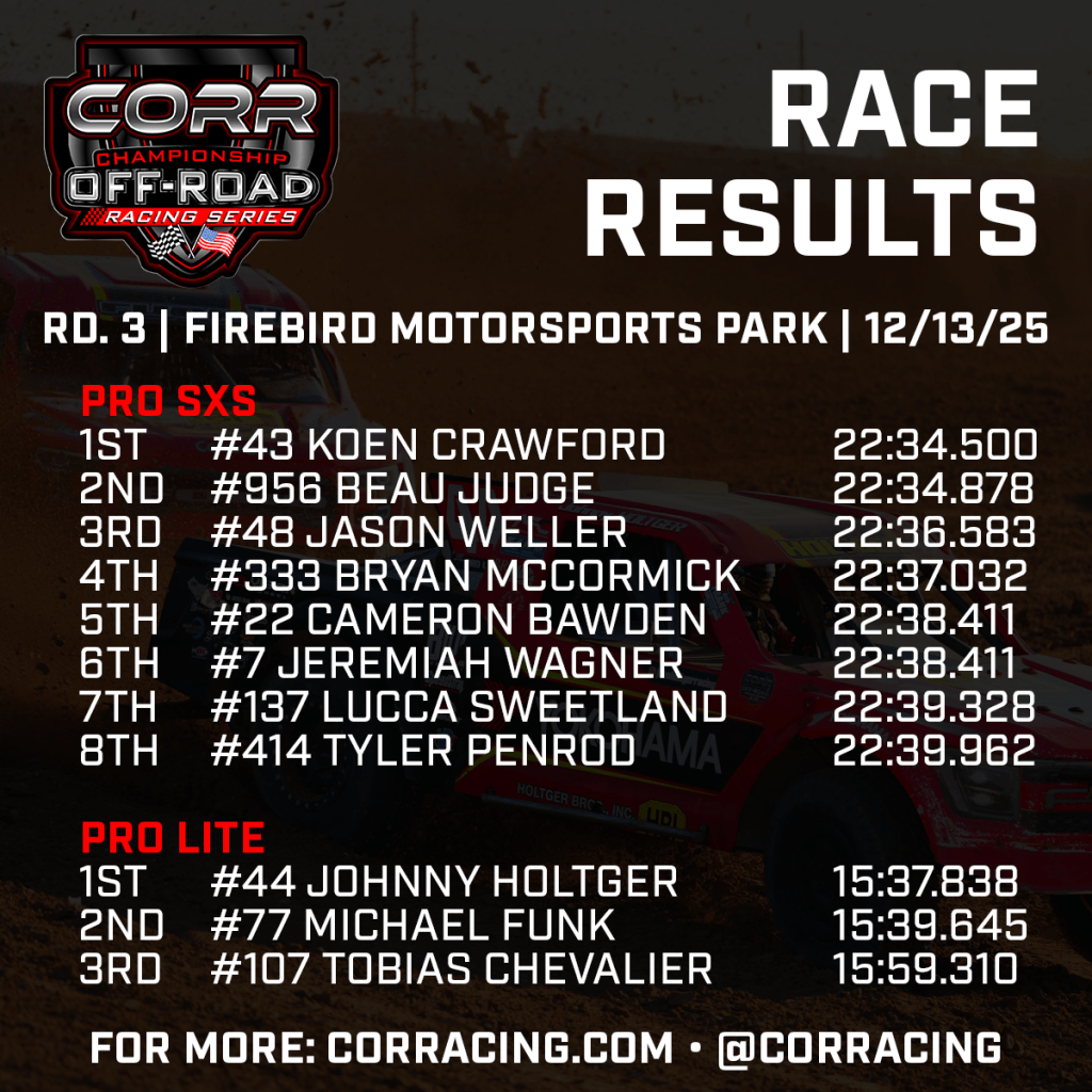 Three of Championship Off-Road Racing (CORR)’s top Pro classes have seen three different winners in as many races to start the 2025-26 season after Saturday’s action at Firebird Motorsports Park. Koen Crawford (Pro SXS) and Johnny Holtger (Pro Lite) took wins in their first turns behind the wheel this season, while Trent Ouellette (Pro NA) broke through after posting the top qualifying time at both events so far this year.