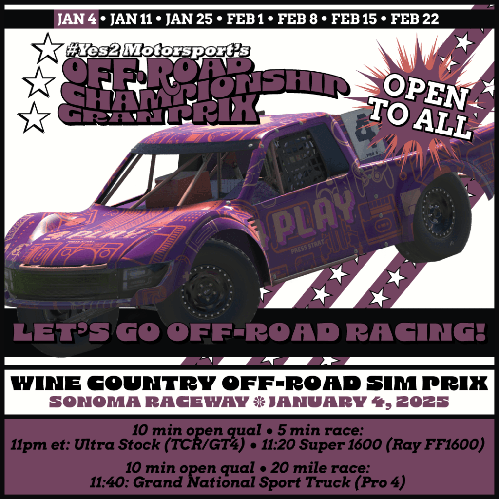 - January 4*: Wine Country Off-Road Sim Prix | Sonoma RX